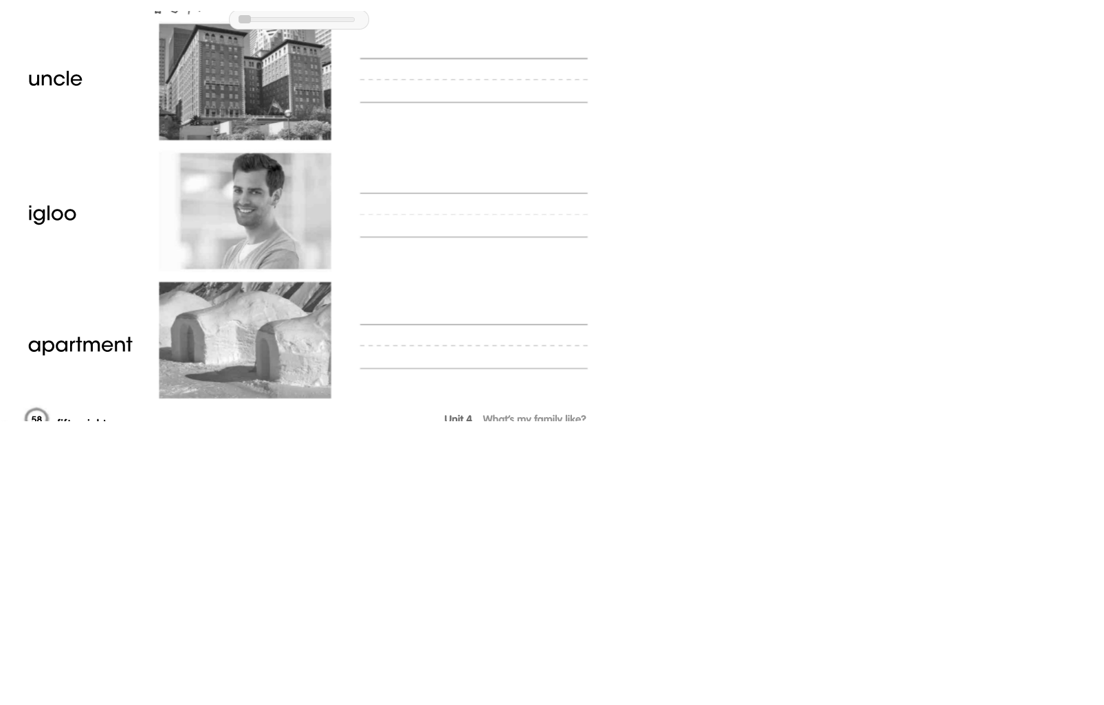 5. Realiza pagina 58 del libro Crickets de ingles, une la imagen con la palabra correcta y luego escribe al frente de cada imagen la palabra correcta.