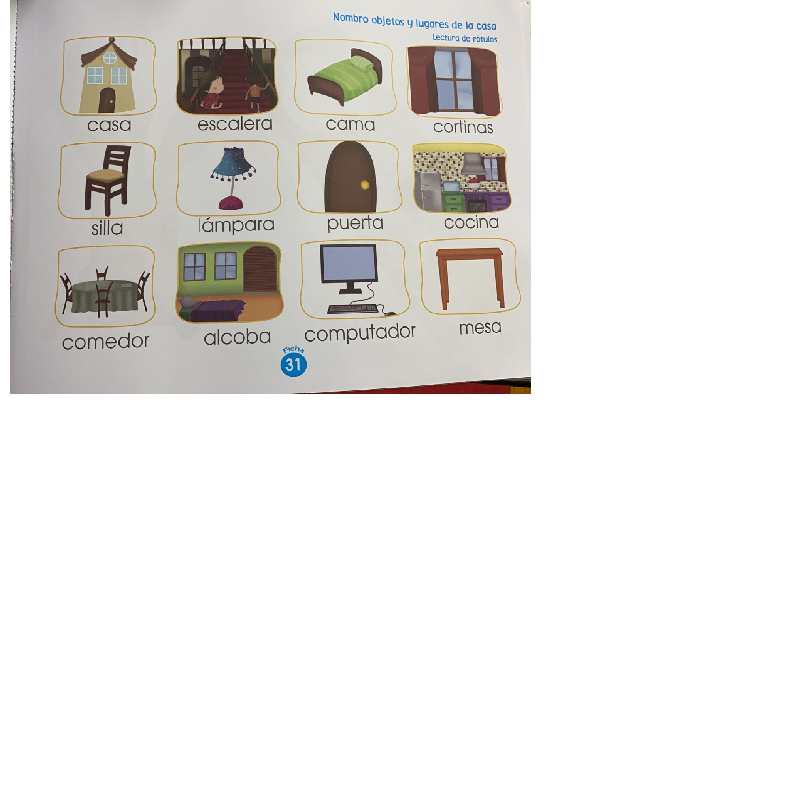 3. De la pagina 31 del libro Cucu cantaba la rana , recorta 6 imagenes ( partes de la casa ) pegalas en el cuaderno de tareas y al frente escribe la palabra en ingles, practica el vocabulario.
