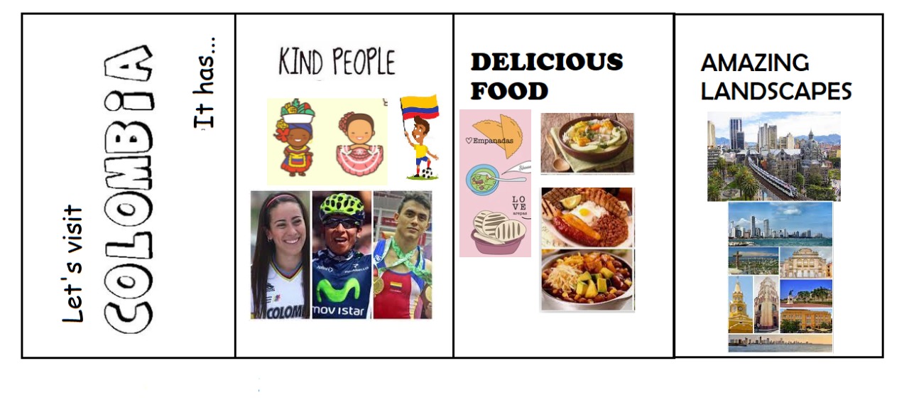 Con una hoja de block, recortes de revistas/periódicos y material para decorar elaboraremos un folleto/collage ilustrado que invite a los extranjeros a visitar nuestro país. En él mostraremos las razones por las cuales nos sentimos orgullosos de ser colombianos a través de imágenes y/o dibujos que representen las cosas que más nos gustan de Colombia...
